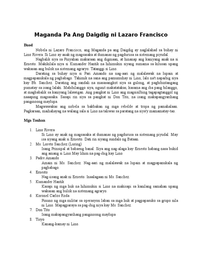 This novel challenged its readers to solve or alleviate the festering wound of Philippine society. Maganda pa ang Daigdig. Binugbog pa niya ang mga magnanakaw.