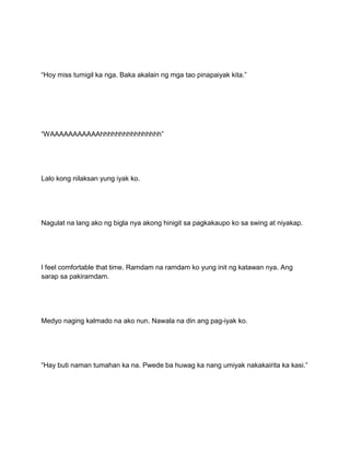 Nginitian ko siya gaya ng ginagawa niya tapos iniwas na lang ang tingin. Kung sa kanta o sa ngiting pinakita ni Inggo hindi ko na alam. Pls share your opinions po i need your help.