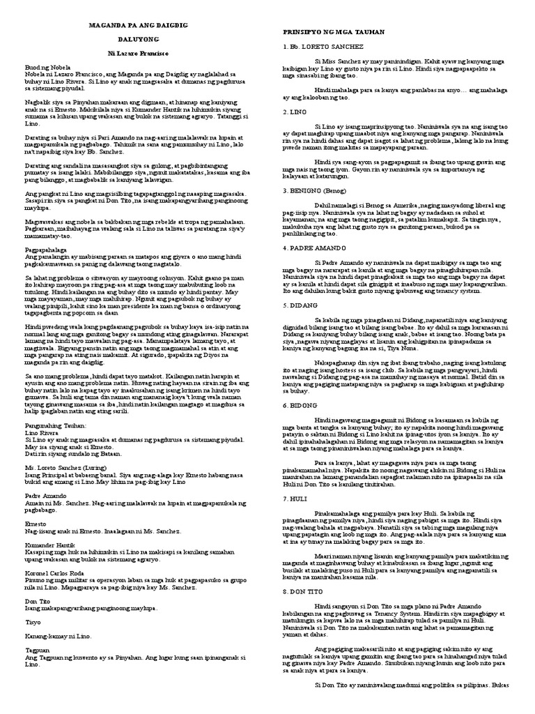 Maganda Pa Ang Daigdig 14 DOC Maganda Pa Ang Daigdig Ang Sampung Natatanging Nobelang Filipino Oct 11 2012 Isa sa pinakasikat na nobela ni Ka Soro ang Maganda Pa Ang Daidig na seryalisadong inilathala sa Liwayway noong 1955 at talaga namang pumatok sa mga tagapagtangkilik ng naturang babasahin. Ito ay pumapaksa sa mga aktwal na pangyayari o kayay mga sitwasyong nahahawig sa mga aktwal na kalagayang umiral sa. Sa halip na makiiyak sa mga pusong nasiphayo sa pagsinta o makigalak sa mahirap na biglang yumaman ang nobelay humamon sa mambabasa na lunasan ang nagn.